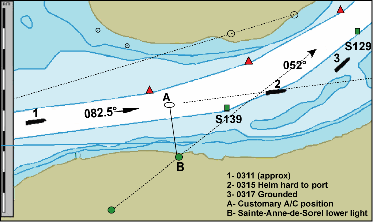 The TSB found that the pilot, who had the conduct of the vessel, did not order a timely course alteration. Fatigue may have been a factor in the pilot’s decreased vigilance at a critical time. The officer of the watch did not effectively monitor the vessel’s progress, and effective bridge resource management techniques were not used in the minutes leading up to the grounding. Communication between bridge team members was minimal. The report also noted that without local knowledge or ECS or ECDIS, the officer of the watch had limited means to monitor the vessel’s track and intervene effectively in complex pilotage waters.